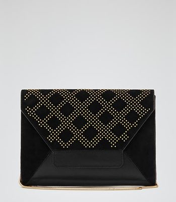 Reiss studded envelope clutch. Combining luxe leather with gleaming gold hardware, the Jonah envelope clutch is a contemporary classic. Finished with an interior zip - ideal for storing your daily essentials - this compact style will add a touch of opulence to after-dark attire.